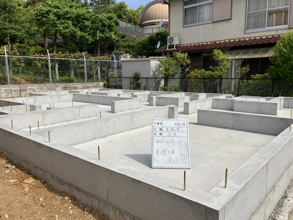 このような敷地においては、建物を建てる前段階で、外構工事計画の精度を高めていくことが重要です。(普段は、建物の工事を終えてから、外構工事を進めてく流れになっております)具体的には、門灯やインターホンで使用する配管類を事前(基礎工事段階)に仕込むことで、外構工事の際に作業を円滑に行うことができます。
