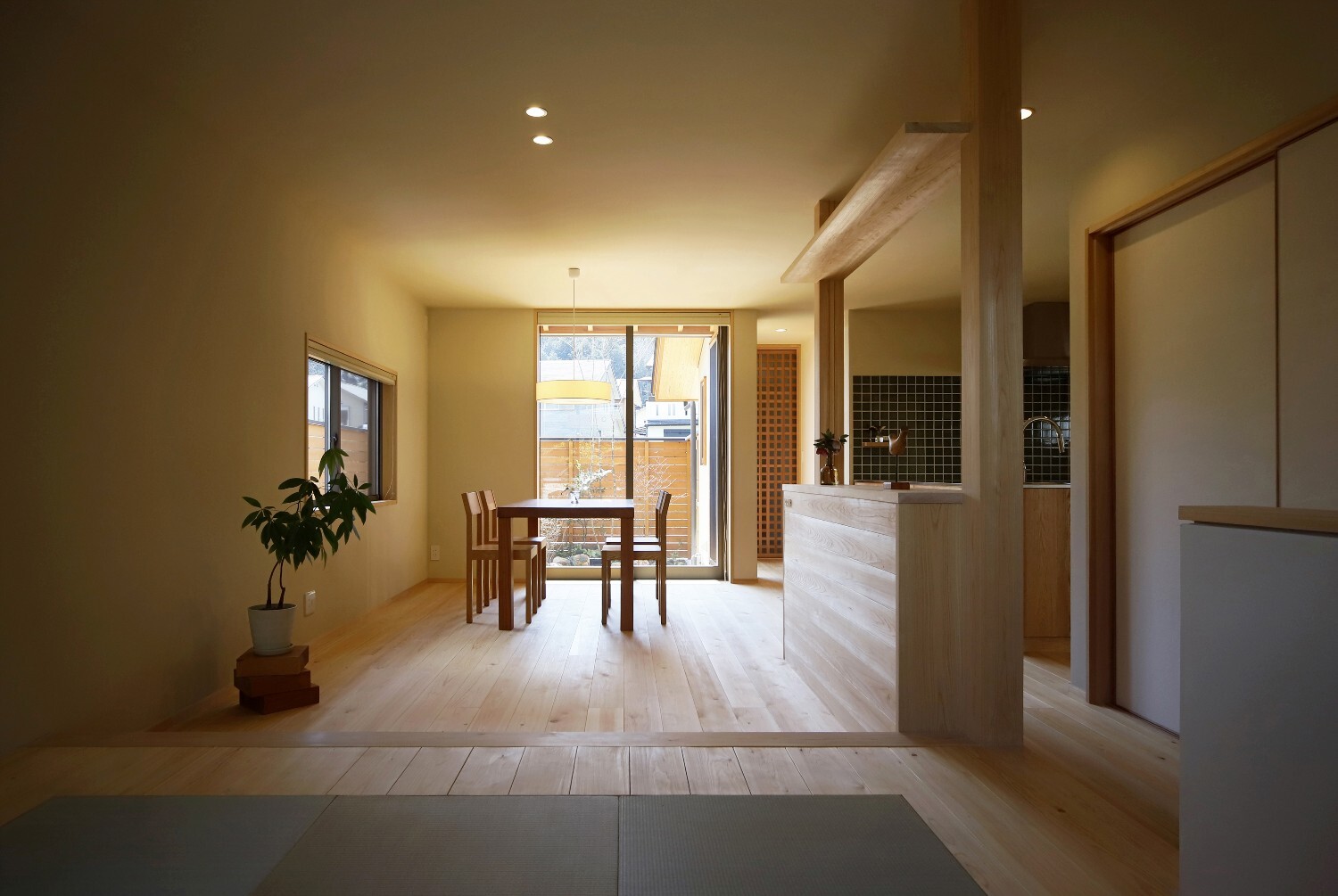 左官仕上でフラットな天井のシンプルな空間ですが、敷地の広さを最大限に感じられるように窓の位置や大きさを考え、外とのつながりを大切にしたのびやかさのある住まいです。