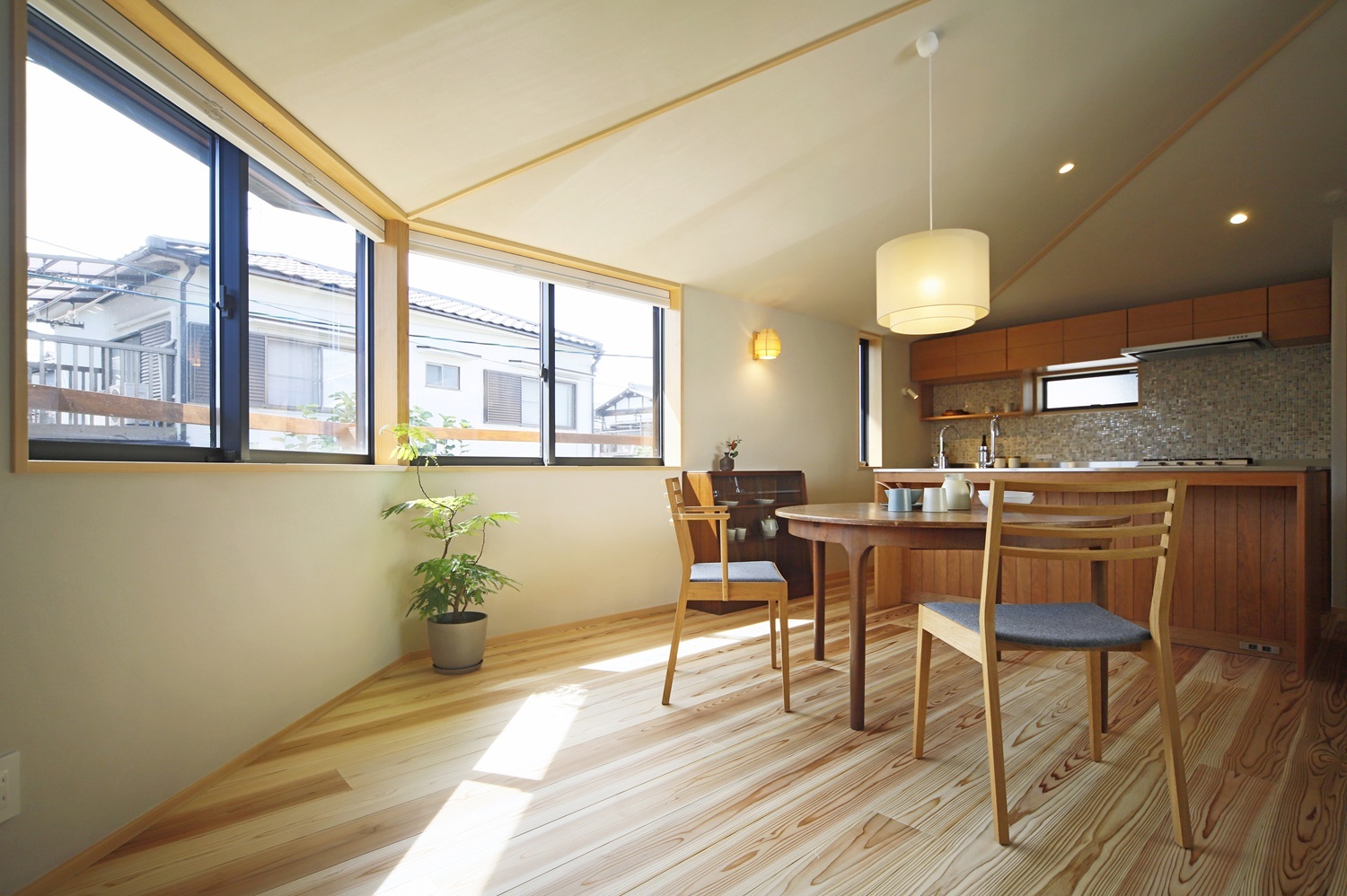 五角形の勾配天井に包まれた2階リビングのコーナー窓からは、西山の山並みが見通せて気持ちの良い風が流れ込みます。
