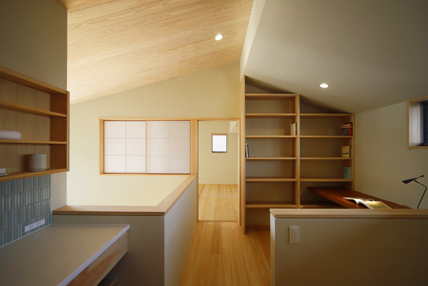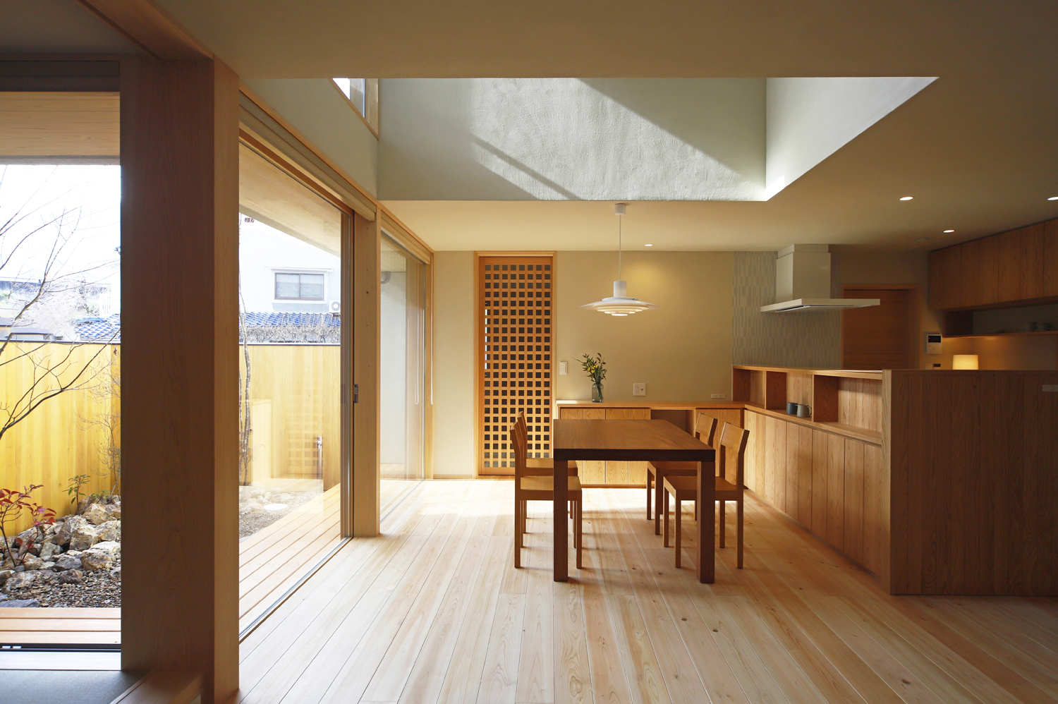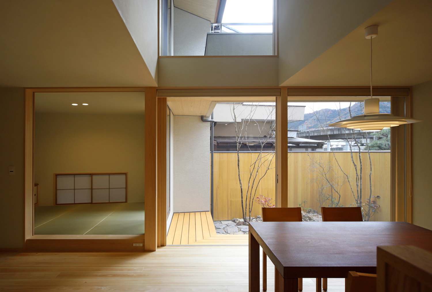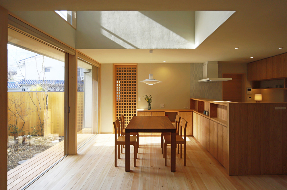 敷地は三方を隣家に囲まれた台形型の変形地で、LDKに連なる和室や2階の洋室を、違和感の無いように敷地に沿った形で計画しました。隣家や通りからの視線を避けるため庭を板塀で囲い込みプライバシーを守りながら、大きな開口部と吹抜けによって自然光をしっかりと取り込み、空間的な広がりを持たせています。