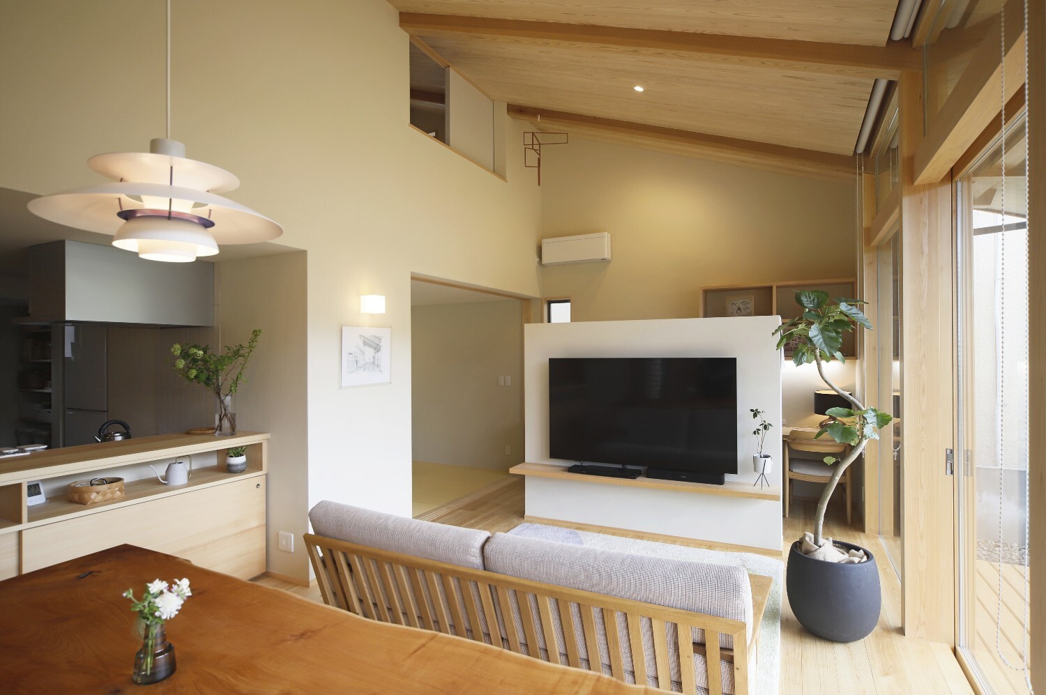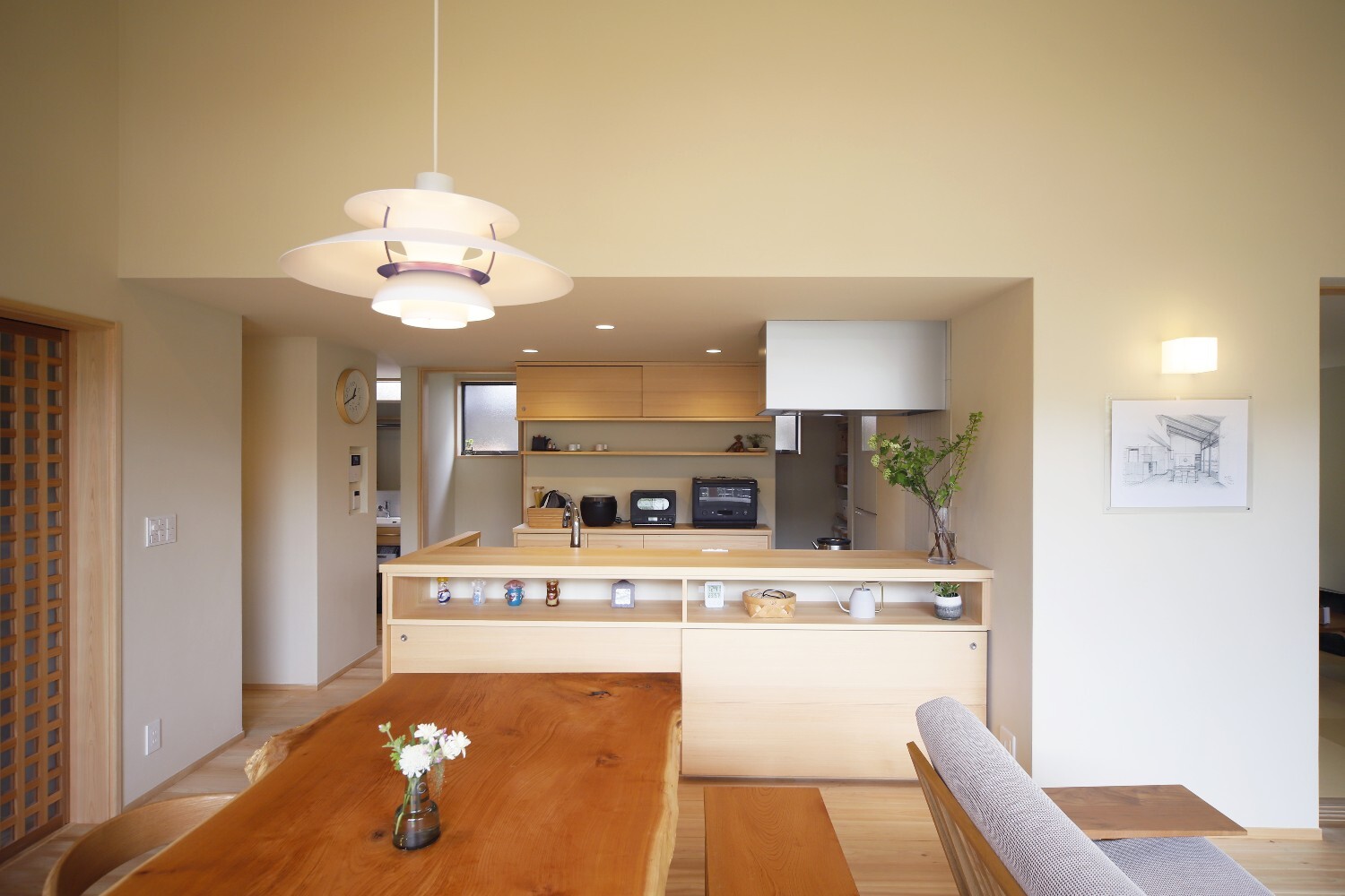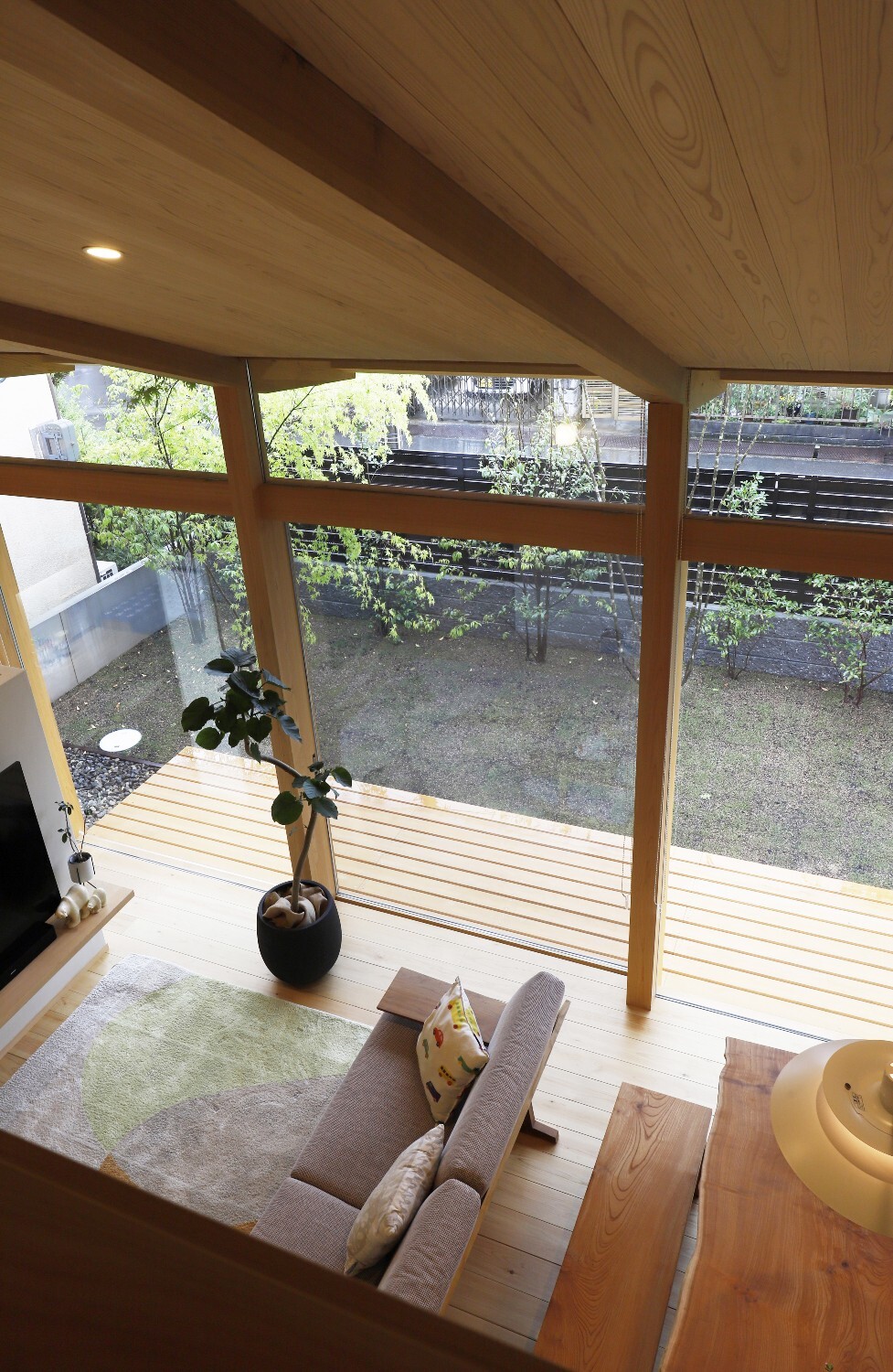 施主の希望である庭へのつながりを重視し、開放的な大きな開口部に対して樹木をしっかりと植えることで、プライバシーを保ちながら自然に触れ合う時間を大切にした住まいです。