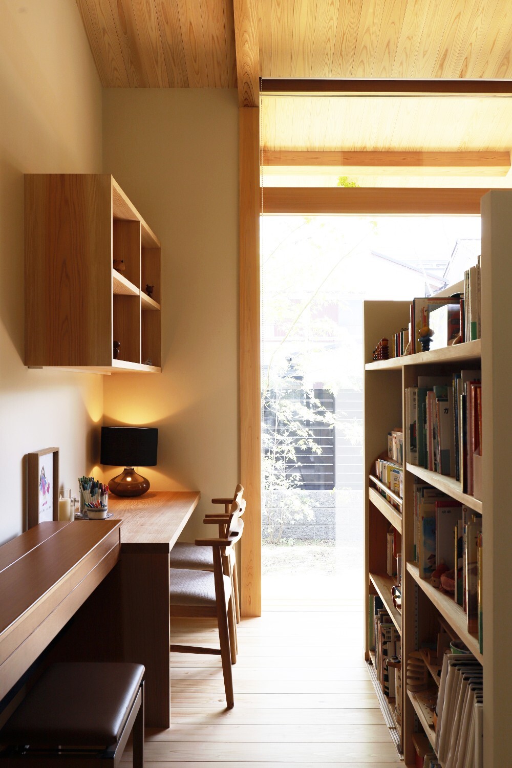リビングには間仕切りを兼ねた造作棚を設け、一部スタディーコーナーにして緩やかに空間を分ける計画としました。