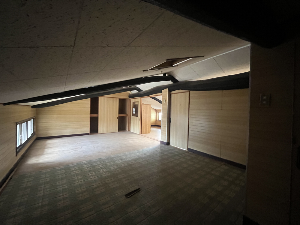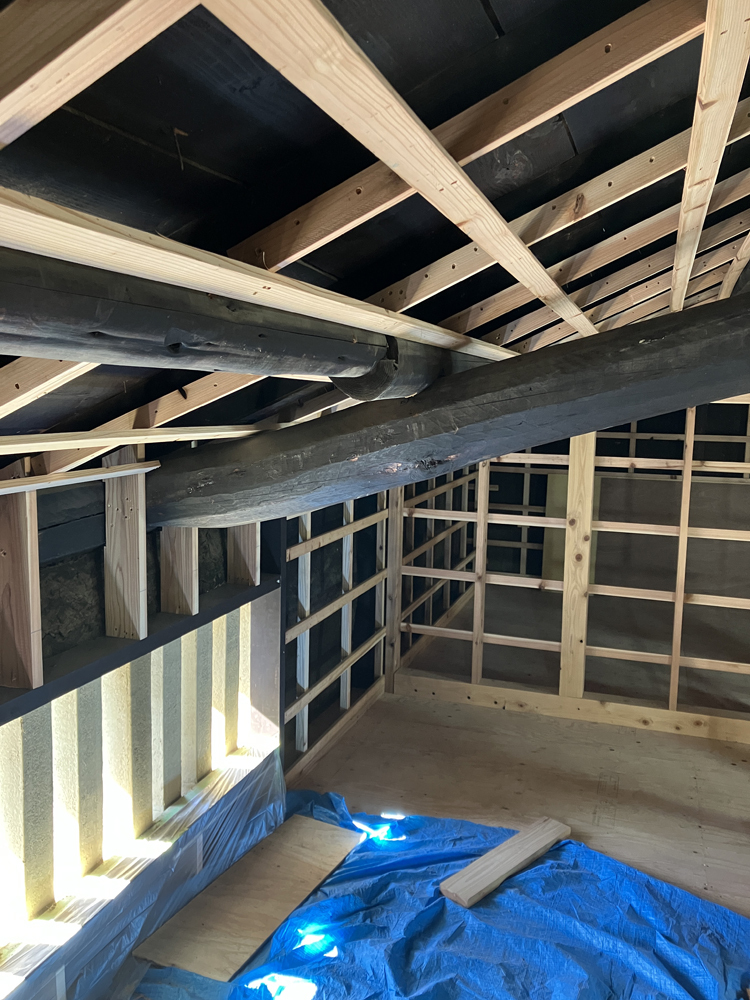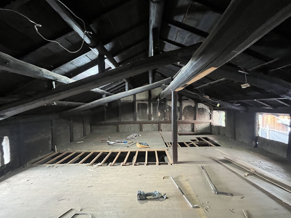 元の仕上げを剥がし終えた2階の様子です。今まで隠れていた斜めにのぼる梁や、梁を支える柱が力強く残っていることが分かります。部材が黒っぽく見えるのは、囲炉裏などを使用した際に、燻されてすすがついたためです。長年燻されたことにより、部材が腐りにくく、防虫効果が期待できるそうです。