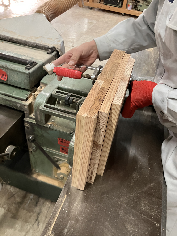 カットした材を重ね、板の断面を削り綺麗に揃えていきます。