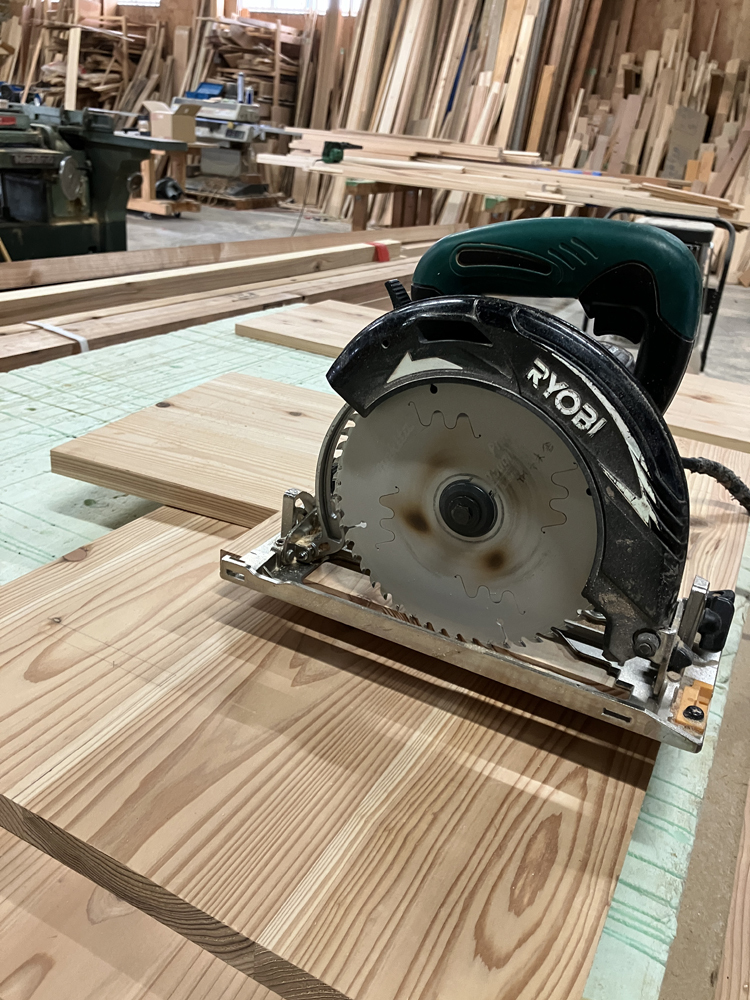 まずは、手書きの設計図をもとに材料を選び、寸法線を書いていきます。今回は、厚み2㎝の杉板を使用しました。