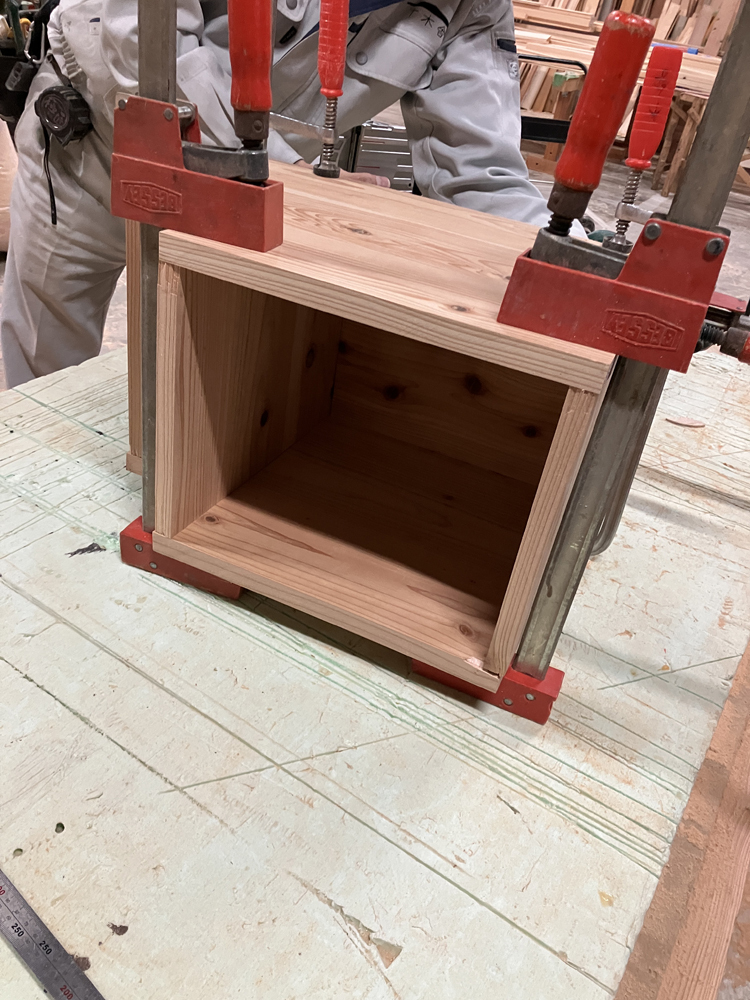 材料を一時的に固定するためのクランプを用いて、四隅の角がしっかりと合うか完成形を確かめていきます。