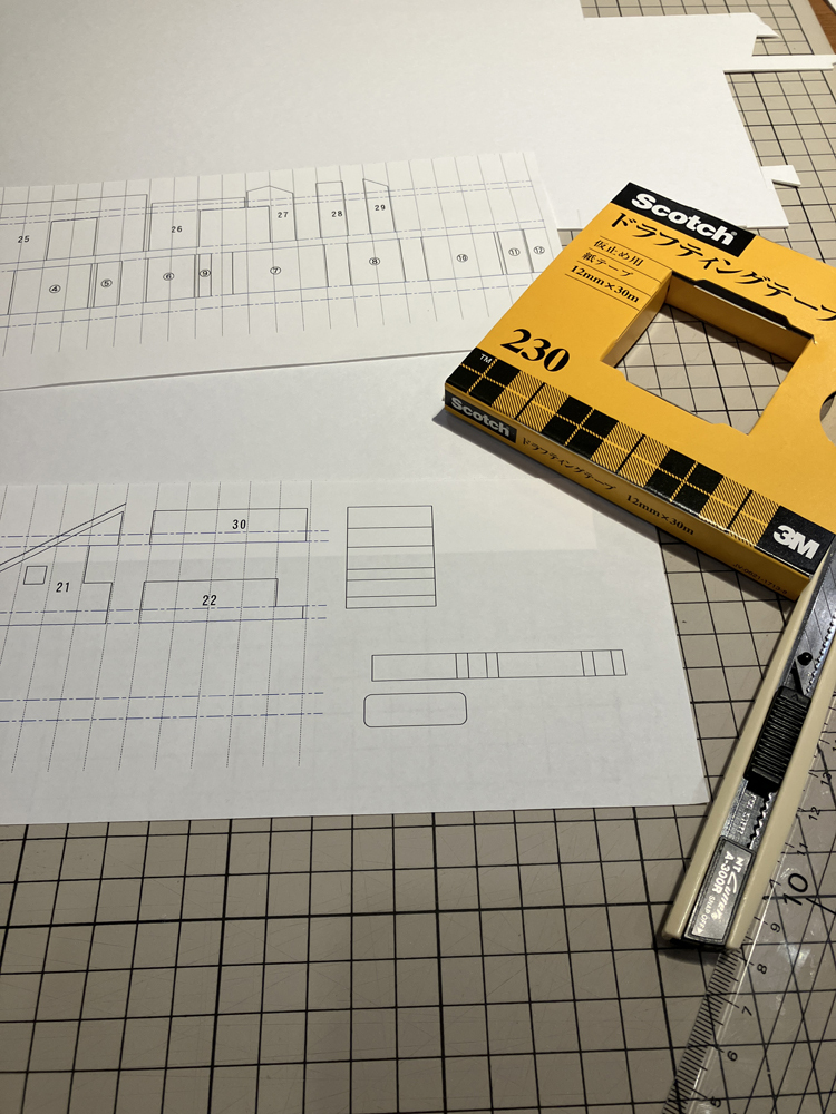 まずは平面図と立面図を印刷し、スチレンボードに貼り合わせて、カットしていきます。