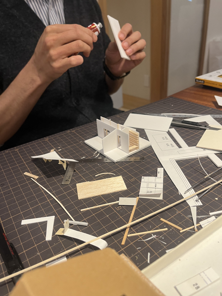 家具や窓枠、階段などの造作部分は、木材や茶色の紙を使って作成していきます。
