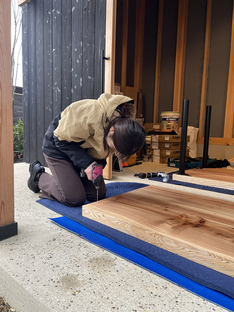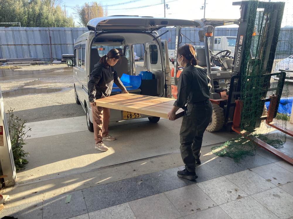 今回は、城陽倉庫から事務所へ移動して作業を行います。スギ板(700mm×1400mm)は、女性2人で簡単に持ち上げることができるので、施工性が良いことも嬉しいポイントですね。