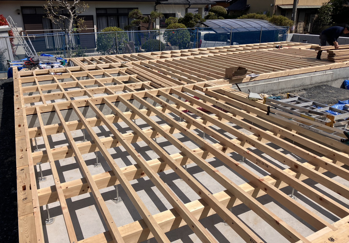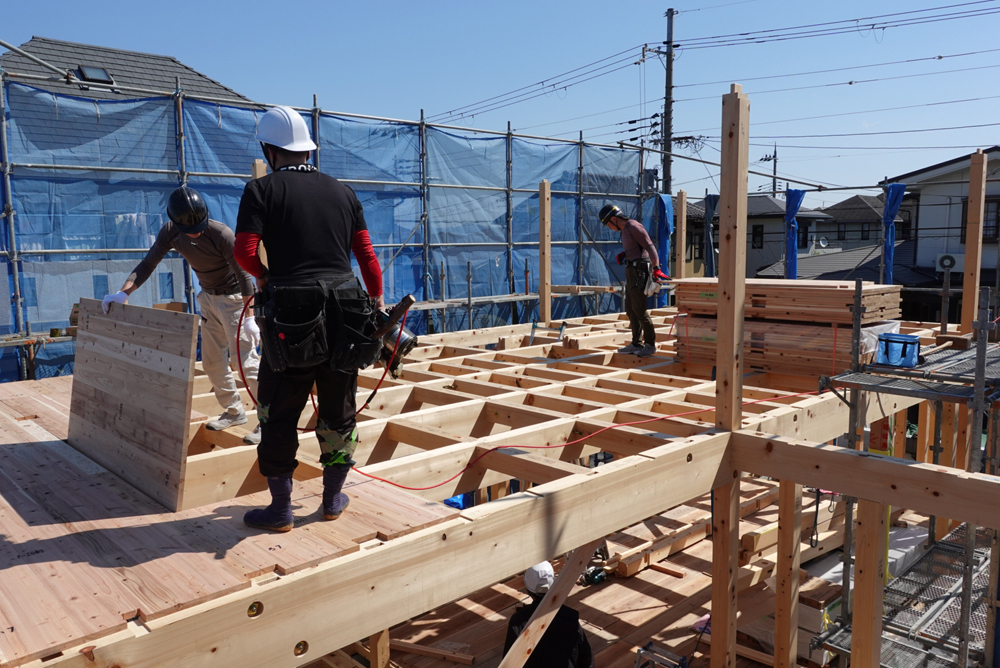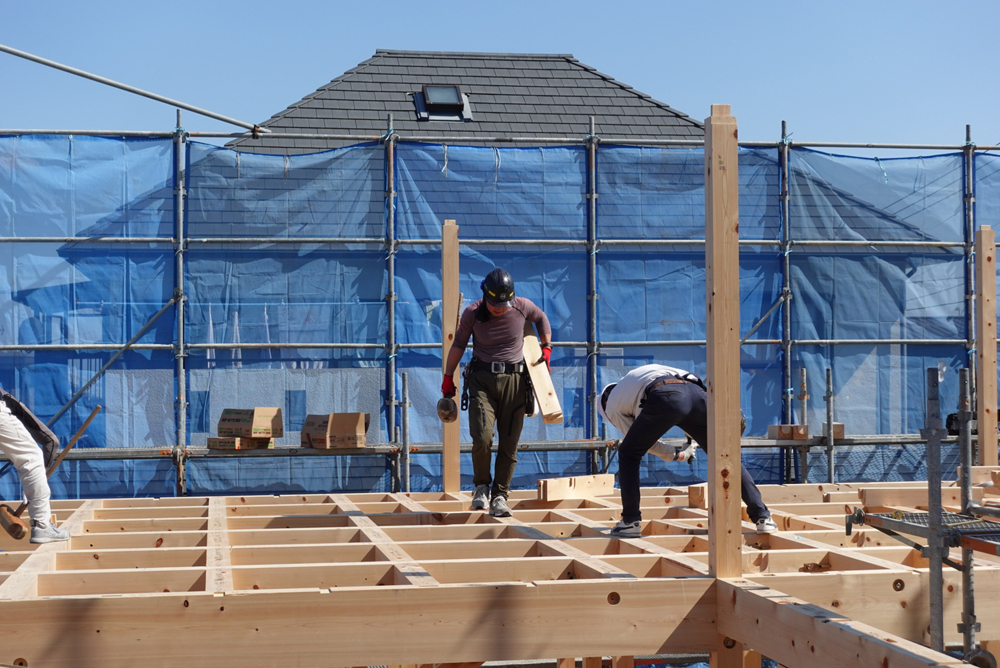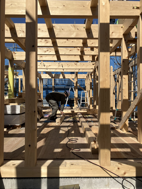 今回はその中で、1階土台敷きから柱、梁の組み立て、2階の床貼りまでの様子をレポートさせていただきます。