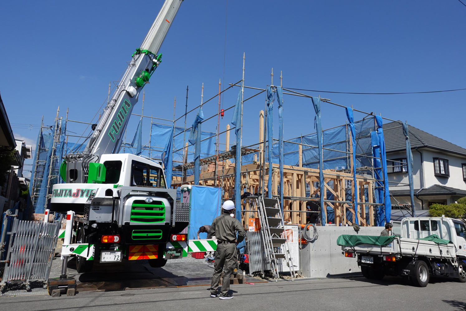 そして上棟の初日、紀州産のヒノキ材をレッカーで運び込み、大工さんが手作業で組み上げていきます。