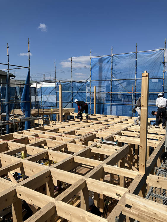 今回の現場は、総ヒノキの家づくり。柱だけでなく梁にも厳選されたヒノキを採用しております。現場の前を通りかかった近隣の方からも、「良い木材を使っていますね」と嬉しいお声掛けをいただきました。