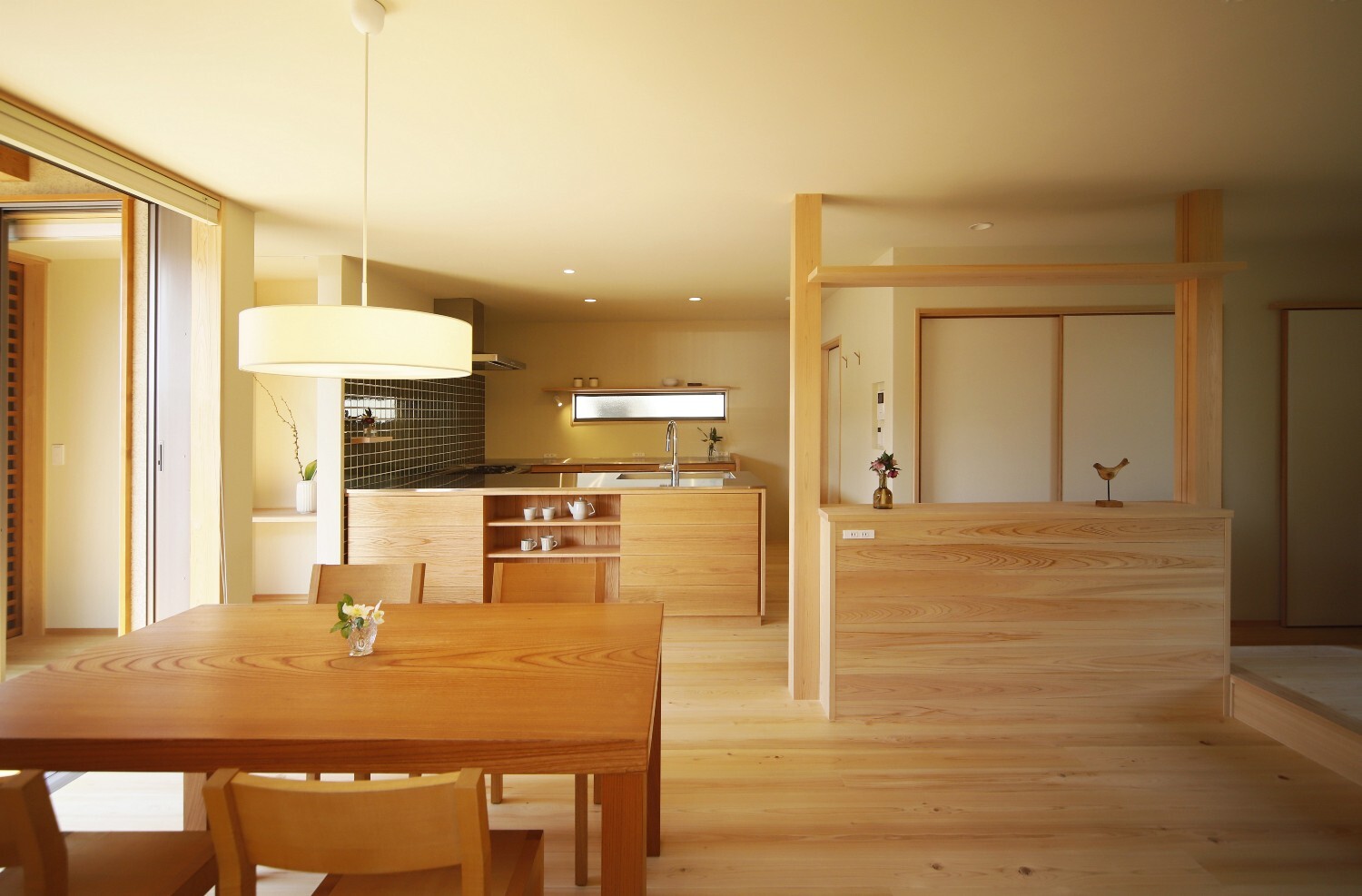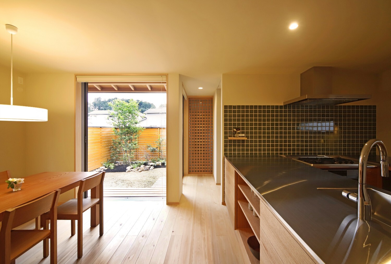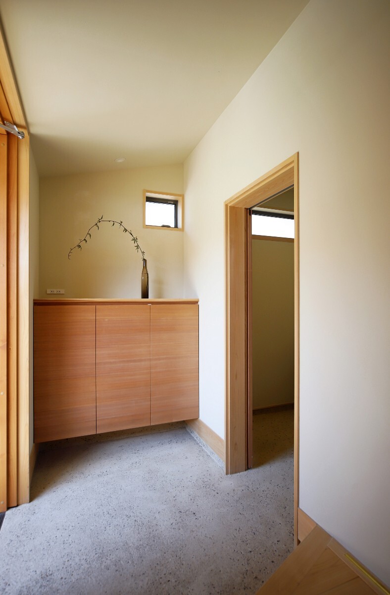 左官仕上でフラットな天井のシンプルな空間ですが、敷地の広さを最大限に感じられるように窓の位置や大きさを考え、外とのつながりを大切にしたのびやかさのある住まいです。