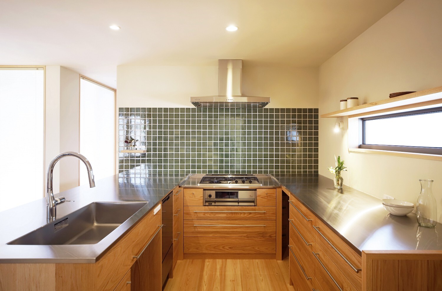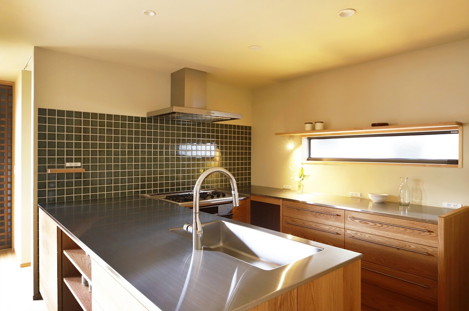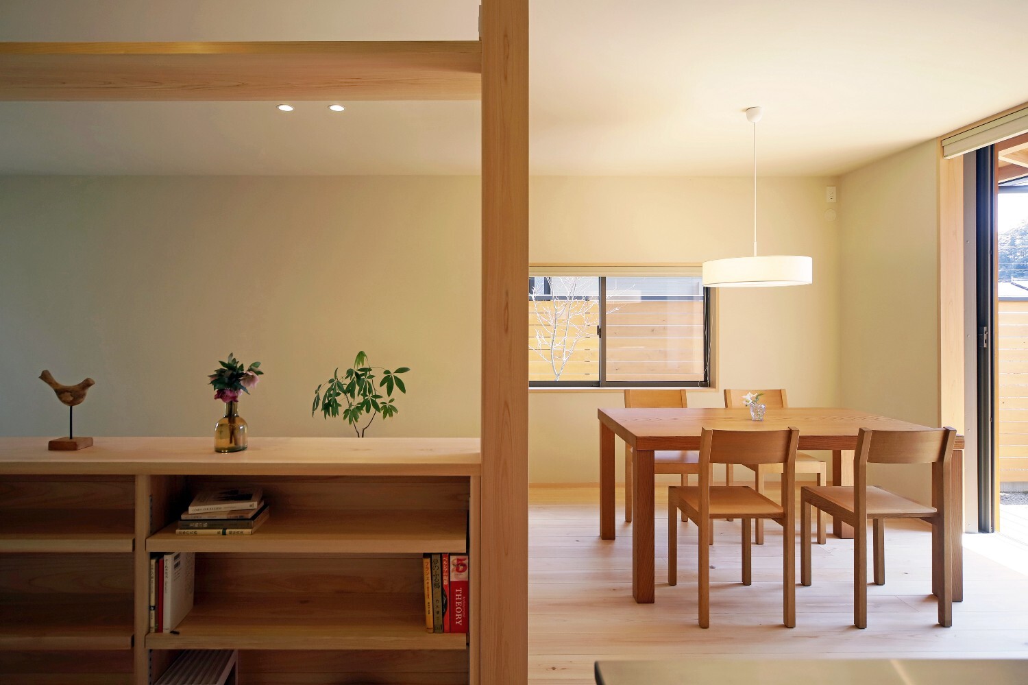 左官仕上でフラットな天井のシンプルな空間ですが、敷地の広さを最大限に感じられるように窓の位置や大きさを考え、外とのつながりを大切にしたのびやかさのある住まいです。
