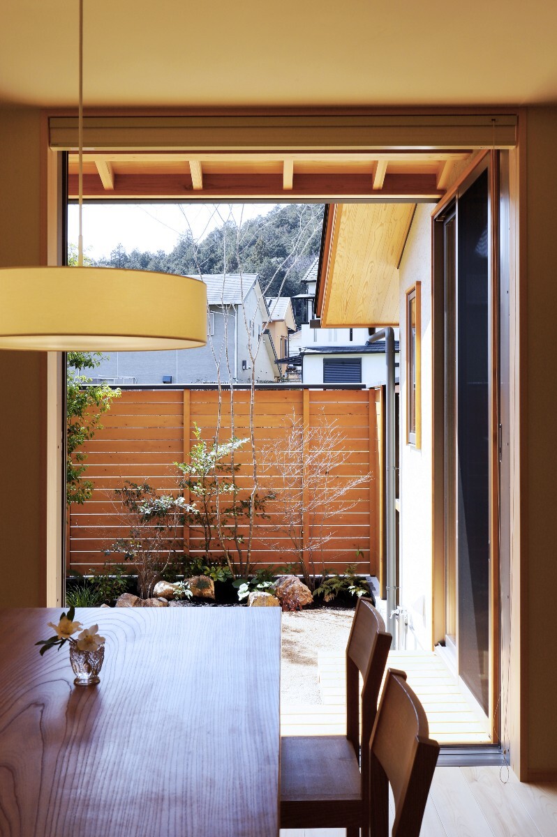奥行のある敷地の南北に庭をつくり、LDKが庭に囲まれた間取りとしました。