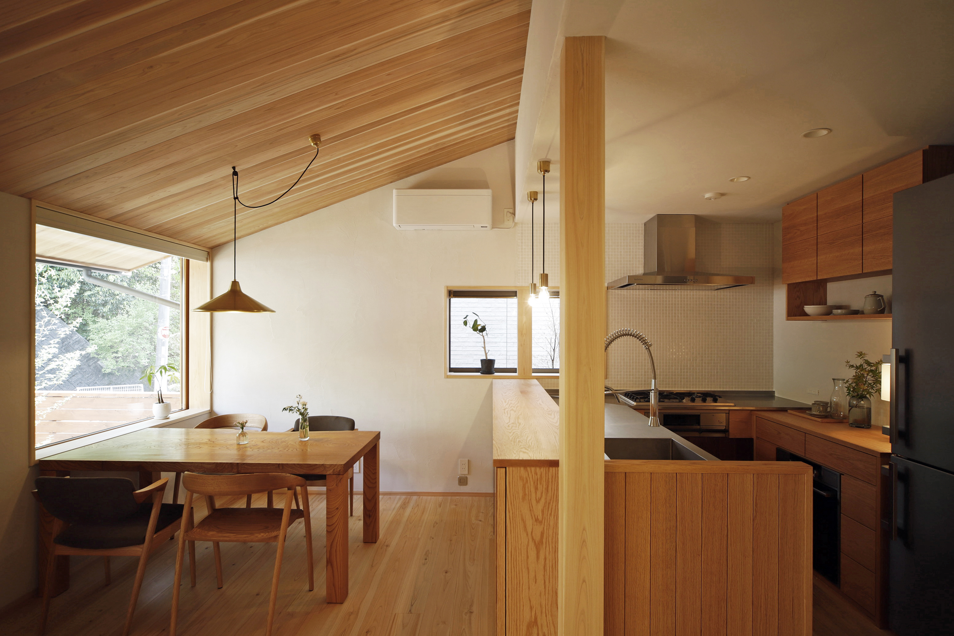 延床面積約26.5坪のコンパクトな建築は、周囲の山並みへ向き合う間取りとしました。内と外との境界が和らぐように、リビングとダイニングの窓には木製サッシを採用しています。