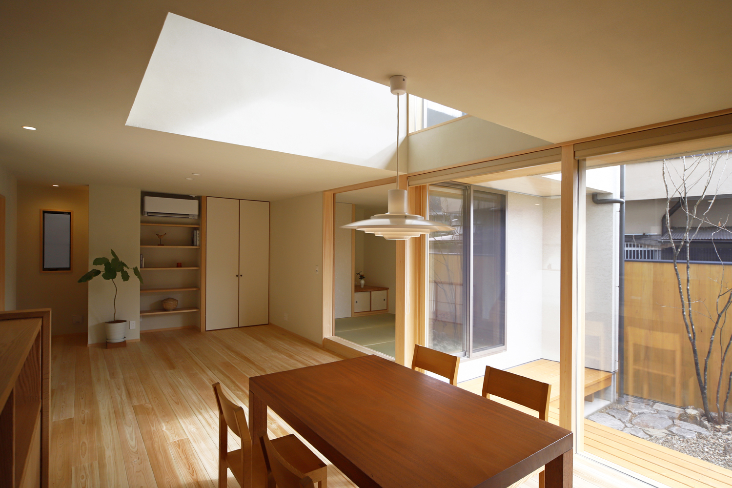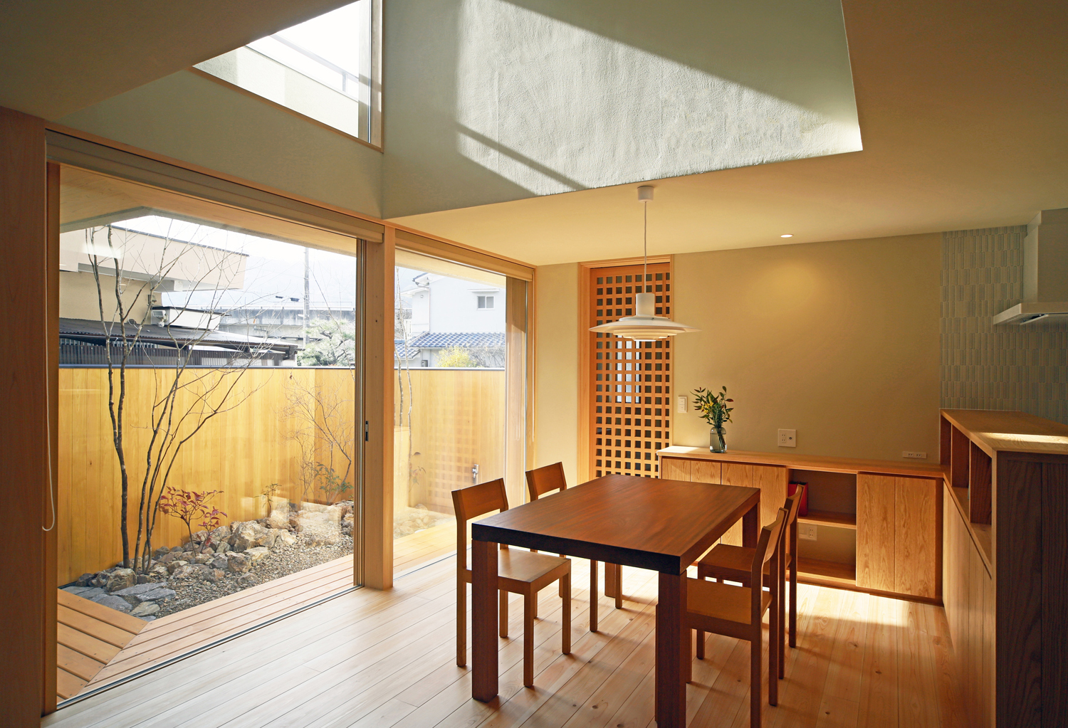 隣家や通りからの視線を避けるため庭を板塀で囲い、プライバシーを守りながら大きな開口部と吹抜けによって自然光をしっかりと取り込みました。