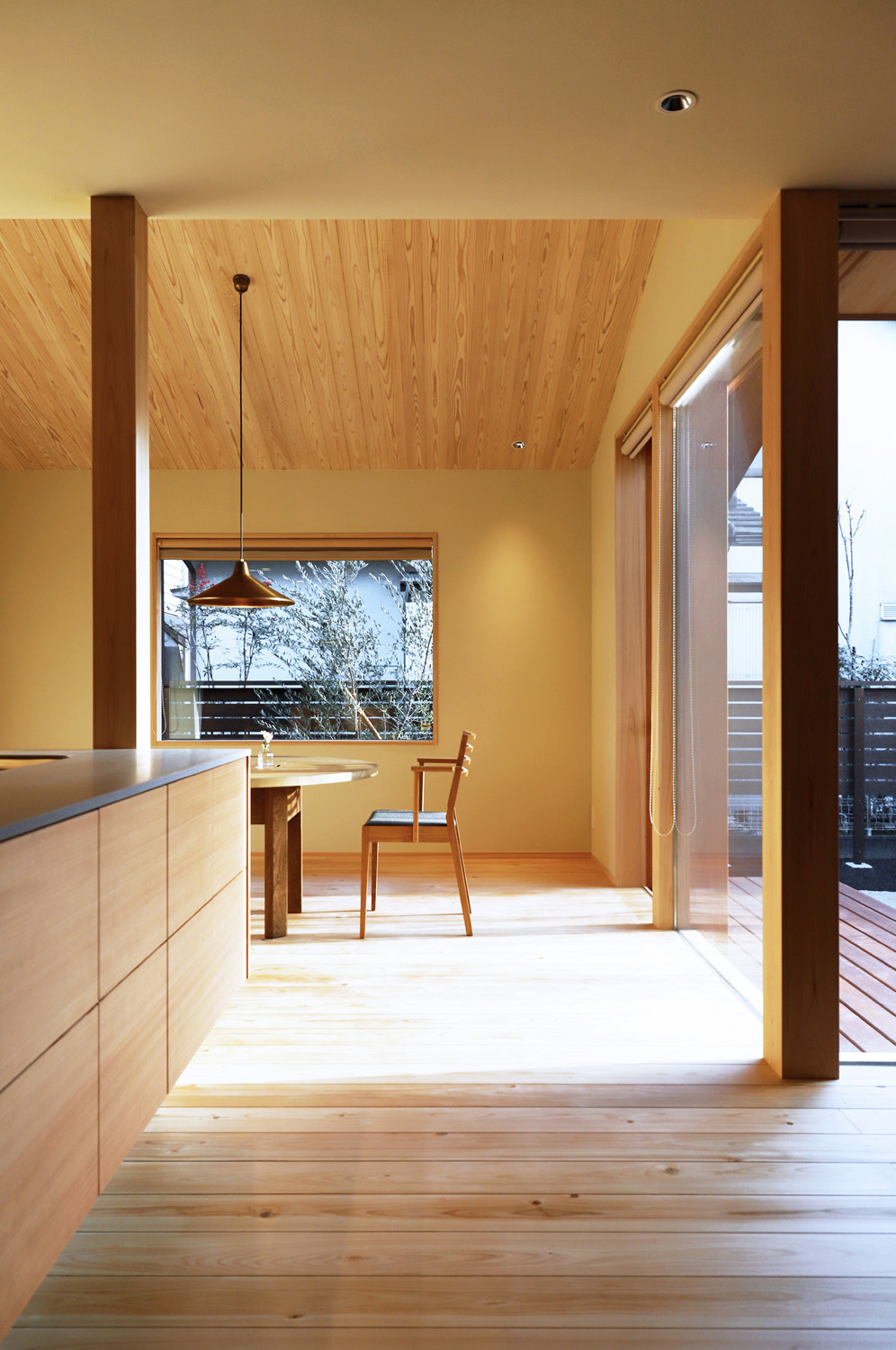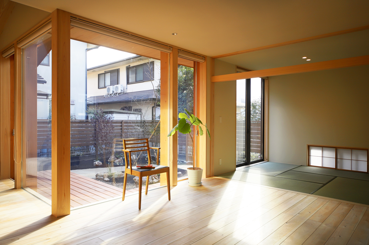 長年の生活の中で熟知した陽の射し方や風の抜け方をお聞きし、間取りに反映させています。木製サッシを使い、庭を囲みこむように配置したLDKは、自然や緑の心地よさが感じられる場所となりました。