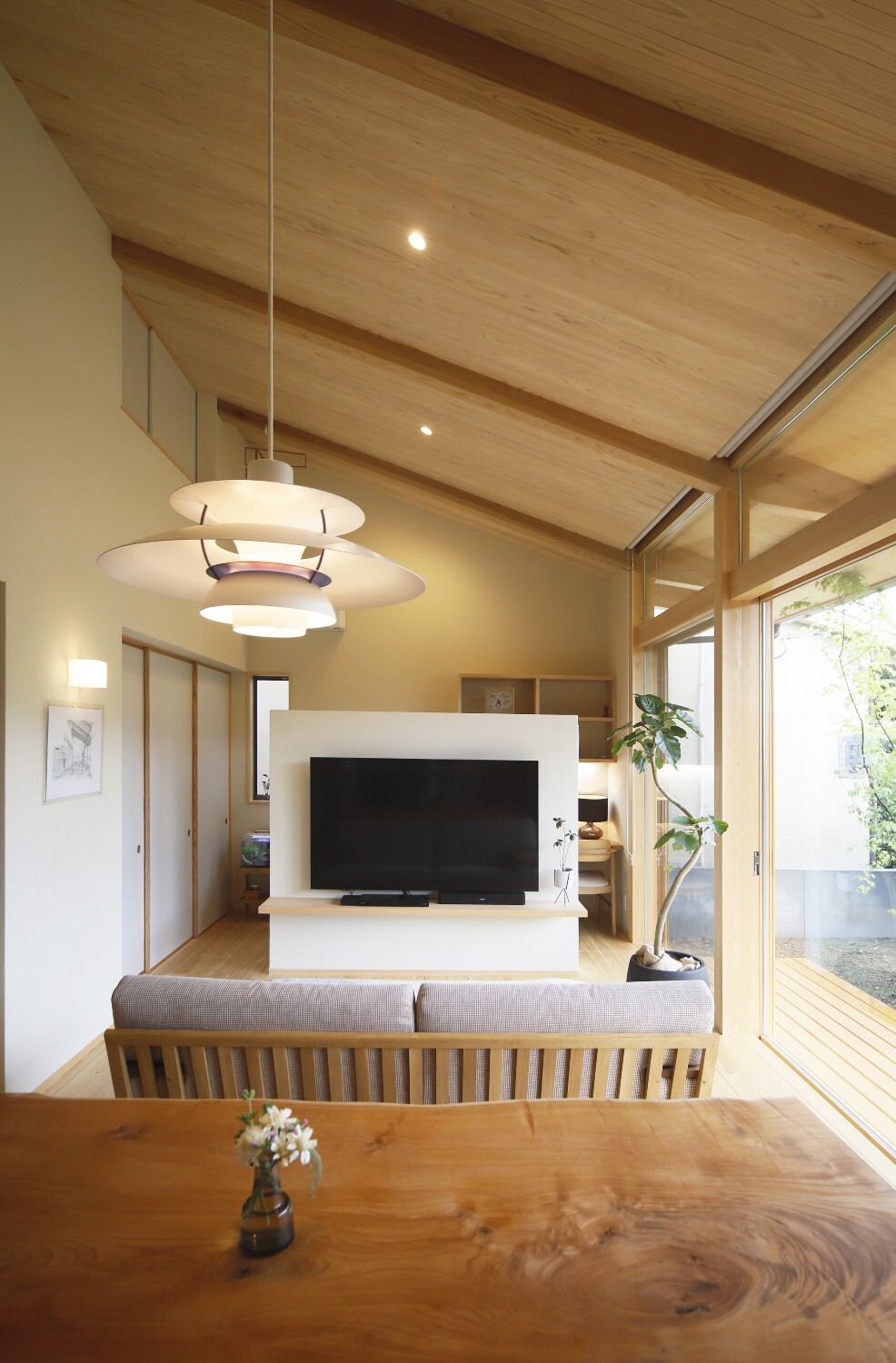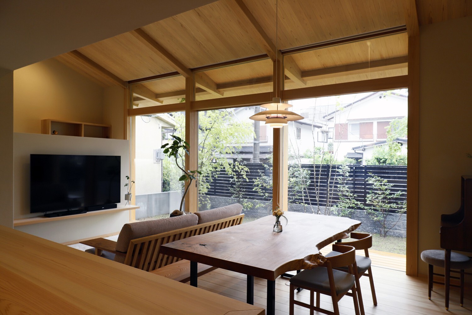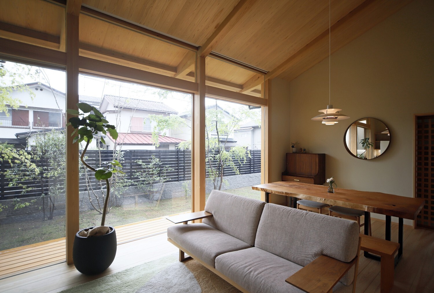 施主の希望である庭へのつながりを重視し、開放的な大きな開口部に対して樹木をしっかりと植えることで、プライバシーを保ちながら自然に触れ合う時間を大切にした住まいです。