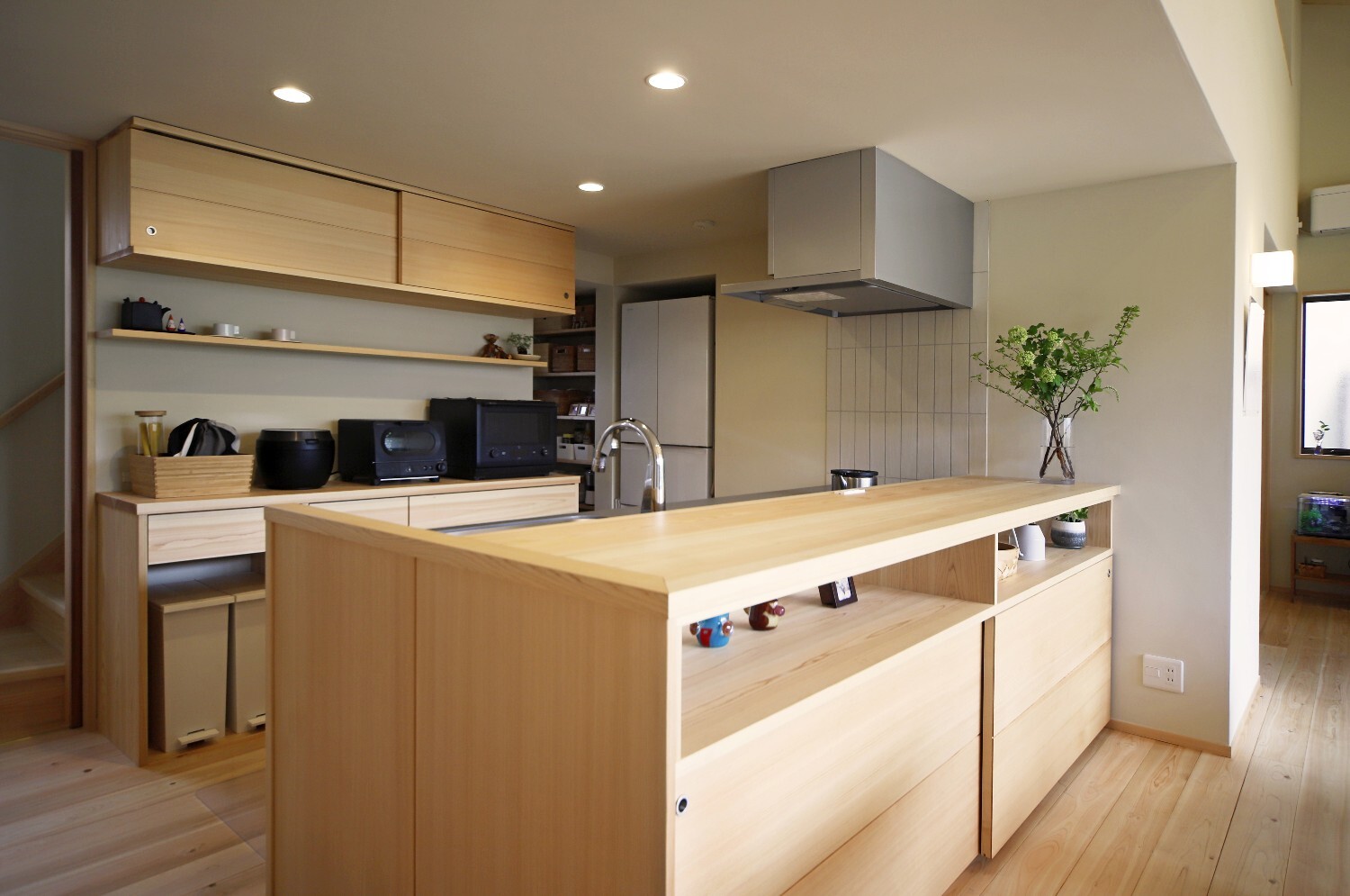 リビングには間仕切りを兼ねた造作棚を設け、一部スタディーコーナーにして緩やかに空間を分ける計画としました。